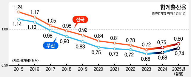 부산 지역 합계출산율은 전년도 0.68명에서 지난해 0.74명으로 0.06명(8.3%) 늘었다. 2020년(0.75명) 이후 5년 만에 가장 높은 수준이다. 합계출산율은 여성 1명이 평생 낳을 것으로 예상되는 자녀 수다.