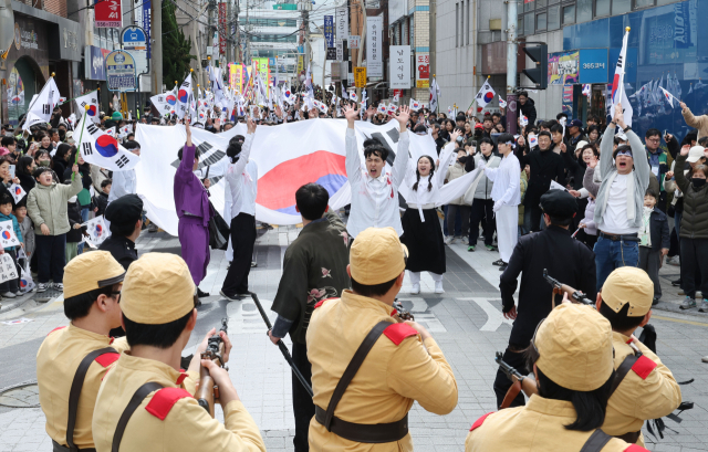 제107주년 3·1절인 1일 오전 부산 동래구 동래시장 일대에서 ‘동래 3·1독립만세운동’ 재현 행사가 진행되고 있다. 이날 행사에는 학생과 주민 등 2000여 명이 참여해 모든 계층이 함께했던 3·1독립운동의 역사적 의미를 되새겼다.