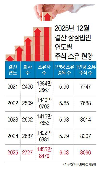 증시 활황 속에 지난해 12월 결산 상장법인의 주식 소유자가 전년 대비 33만 명 증가한 1456만 명에 달하며 역대 최대를 기록했다. 개인 투자자가 전체의 99% 이상을 차지하며 여전히 시장을 주도하는 가운데, 삼성전자가 가장 많은 주주를 보유한 종목으로 집계됐다.