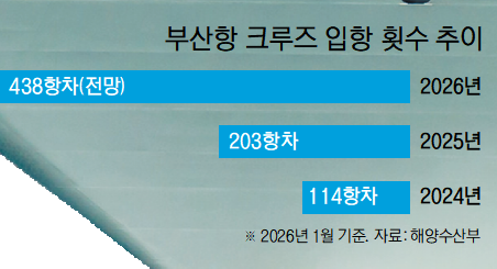 입항 횟수도 올해 최다를 기록할 예정이다. 지난 1월 기준 ‘2026년 부산항 크루즈 입항 계획안’에 따르면 부산항에는 2024년 114항차, 지난해 203항차에 이어 올해는 부산항 개항 이래 최대 규모인 총 438항차의 크루즈선이 입항할 예정이다. 특히 부산항에 입항할 중국발 크루즈는 총 173항차로, 지난해 8항차 대비 21배 이상 증가했다.