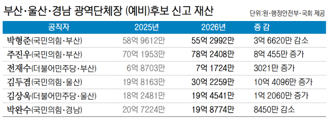 6.3 지방선거 부산·울산·경남 광역자치단체장 재선에 도전하는 현직 단체장 중 국민의힘 박형준 부산시장과 박완수 경남도지사의 신고 재산은 줄고, 김두겸 울산시장은 증가한 것으로 나타났다.