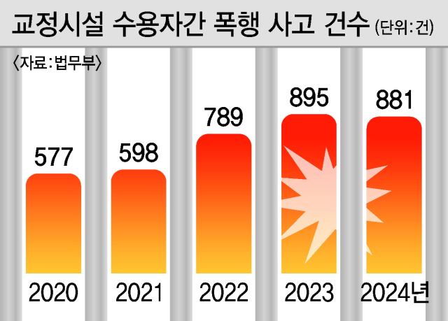 29일 법무부에 따르면 교정시설 내 수용자 간 폭행사건은 2020년 577건에서 2024년 881건으로 1.5배 늘어났다. 같은 기간 폭행 관련 입건·송치 건수도 361건에서 658건으로 2배 가까이 늘어난 것으로 나타났다.