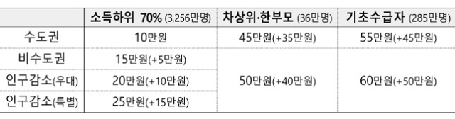 또 차상위·한부모 가족 36만명에겐 수도권은 45만원, 비수도권은 50만원을 지급한다. 기초수급자 285만명에게는 수도권 55만원, 비수도권 60만원을 각각 지급한다.