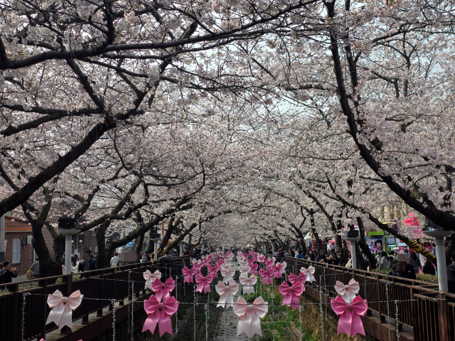31일 부산지방기상청 등에 따르면 경남 창원시 진해구 벚꽃은 지난달 24일 개화를 시작으로 30일 만개했다. 개화는 벚나무 전체의 꽃이 20%를 폈을 때, 만개는 80% 이상을 의미한다. 창원 전 지역의 벚꽃 개화율을 확인하는 관측목은 진해구 여좌동 여좌천 로망스다리 옆 벚나무 3그루로, 2015년부터 지금까지 유지되고 있다.