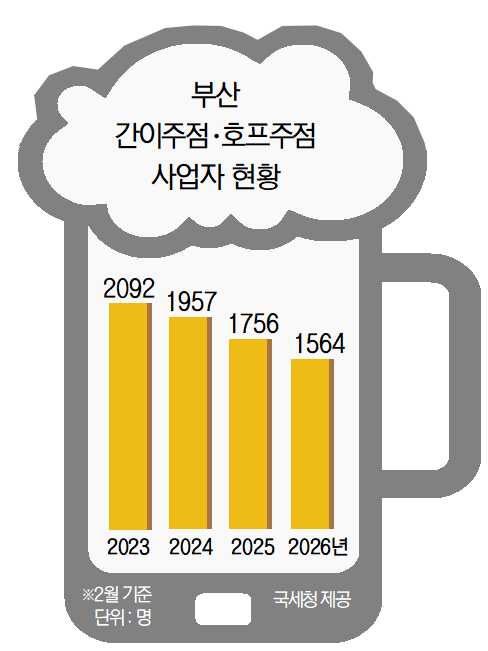 국세청 국세통계포털에 따르면 부산 간이·호프주점 사업자는 2023년 2092명에서 2024년 1957명, 지난해 1756명, 올해 1564명으로 지속적인 감소세를 보인다.
