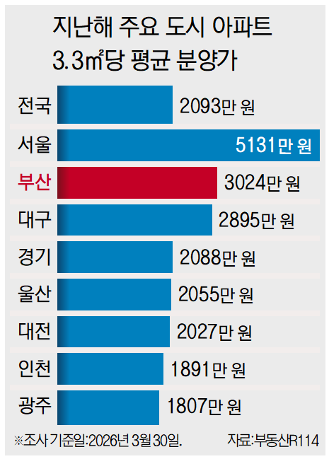 1일 부동산R114에 따르면 지난해 전국에서 분양한 아파트 3.3㎡(평)당 평균 분양가는 2093만 원으로 나타났다. 이 중 부산은 평당 3024만 원으로, 처음으로 3000만 원을 돌파했다. 같은 기간 서울은 5131만 원으로 조사됐다. 대구는 2895만 원, 경기는 2088만 원, 인천은 1891만 원으로 집계됐다.
