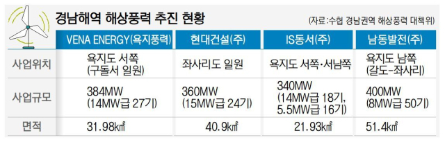 미조풍력을 포함해 욕지도를 중심으로 발전사업 허가를 받았거나 추진 중인 대형 프로젝트만 4건이다. 총계획 면적은 146㎢, 축구장 2만 3000여 개를 합친 크기로 이곳에 에펠탑 높이 구조물 130기 이상을 세운다. 하지만 욕지도 해역은 경남 어민에게 마지막 남은 황금어장이다. 각종 어류 서식·산란장이자 난류를 따라 회유하는 멸치 떼와 이를 먹이로 하는 각종 포식 어류가 유입되는 길목으로 전국 최고 수준의 조업 밀도를 보인다.