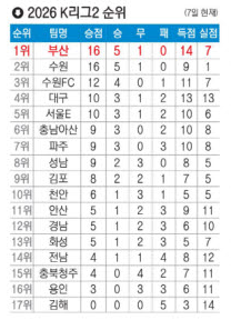 부산은 지난 4일 하나은행 K리그2 2026 6라운드에서 경남FC를 상대로 2-1 승리를 거두며 5연승을 질주했다. 5승 1무(승점 16)로 개막전 무패 행진을 이어간 부산은 수원 삼성(승점 16)에 다득점에서 앞서며 리그 1위에 올라섰다. 부산이 리그 1위에 오른 것은 2023년 11월 26일 이후 무려 862일 만이다.