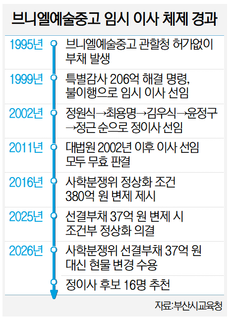 다만, 정이사 체제 전환을 앞두고 불거진 법적 분쟁은 변수다. 정근 전 이사장 측은 8일 부산시교육청과 교육부 등을 상대로 39억 5000만 원 규모의 손해배상 청구 소송을 부산지방법원에 제기했다고 밝혔다. 정 전 이사장 측은 “2006년 당시 교육청의 정식 승인을 거쳐 이사장직을 수행하며 설립자의 부채 등을 상환해 왔지만, 교육청의 행정적 과실과 사분위의 재량권 일탈로 운영권을 상실하게 됐다”고 주장하고 있다.