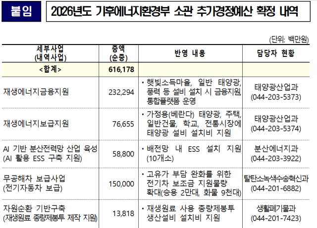 이번 추경은 국회 심의과정에서 무공해차(전기·수소차) 보급사업 등 일부 사업의 증·감액 규모가 조정되고 △재생원료 종량제봉투 제작 설비 지원사업 △재생에너지 노후인버터 교체 지원사업 등이 추가 반영돼 당초 정부안 대비 917억 원이 증가된 6162억 원이 증액됐다. 이로써 2026년 기후부 예산 및 기금의 총지출 규모는 본예산(21조 7588억 원) 대비 2.8% 증가한 22조 3750억 원이 되었다.