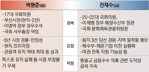 한 정치권 관계자는 “최근 여론조사 흐름만 보면 전 의원이 박 시장에 비해 우세한 것처럼 보이지만 부산은 보수 색채가 짙은 곳이라 막판 변수가 항상 있다”며 “보수 유권자들이 투표장에 얼마나 나오느냐가 결국 승패를 가를 것”이라고 전망했다.