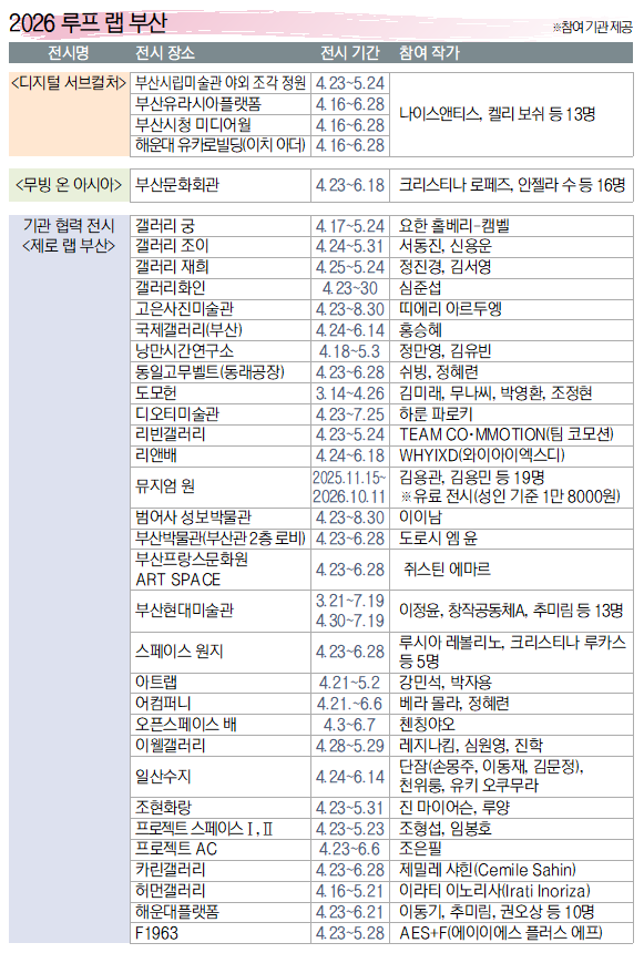 ‘루프 랩 부산’과 연계한 포럼과 작가와의 대화(아티스트 토크)는 22일부터 25일까지 진행된다. 연계 프로그램은 시립미술관 누리집(art.busan.go.kr)을 통해 접수 중이다. 올해 ‘아시아 큐레이터스 포럼’(22일 오전 11시~오후 2시 도모헌)은 아시아 14개국 16명의 기획자가 참여해 ‘디지털 시대, 아시아의 새로운 사회참여 예술’에 대해 다룬다.