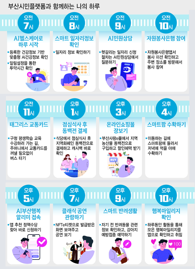 〈부산일보〉에 따르면 부산시민플랫폼 구축 사업은 민간 자본과 기술력으로 공공 소프트웨어를 구축하는 방식으로 진행된다. 그동안 SOC 중심으로 이뤄지던 민간 투자를 국내 처음으로 디지털 분야까지 확대한 것이다. 부산시민플랫폼은 현재 흩어져 있는 행정·금융·복지 서비스를 시민 개개인의 생애 주기에 맞춰 선제적으로 통합 제공하는 ‘손안의 비서’ 역할을 수행하게 된다. 스마트폰만 있으면 동백전과 태그리스 교통카드, 부산사랑e몰, AI 헬스케어, AI 민원 상담, 생활권 지도 서비스, 일자리 통합 정보 등 20개의 기능을 손쉽게 이용할 수 있다. 부산형 디지털 행정혁신이 바꿔놓을 미래가 벌써부터 큰 기대를 모으고 있다.
