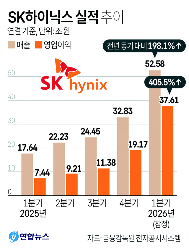 SK하이닉스는 연결 기준 올해 1분기 영업이익이 37조 6103억 원으로 전년 동기 대비 405.5% 증가했다고 23일 공시했다. 매출은 52조 5763억 원으로 198.1% 늘었다. 매출과 영업이익 모두 분기 기준 역대 최대다.