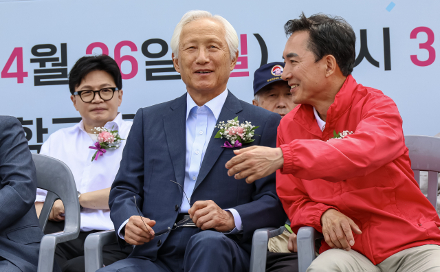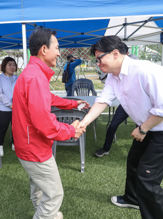부산 북갑 국회의원 보궐선거에서 국민의힘 공천을 바라는 박민식 전 국가보훈부 장관과 무소속 출마를 공식화 한 한동훈 전 국민의힘 대표가 26일 부산 구포초에서 열린 동문운동회에 참석해 있다. 김종진 기자 kjj1761@