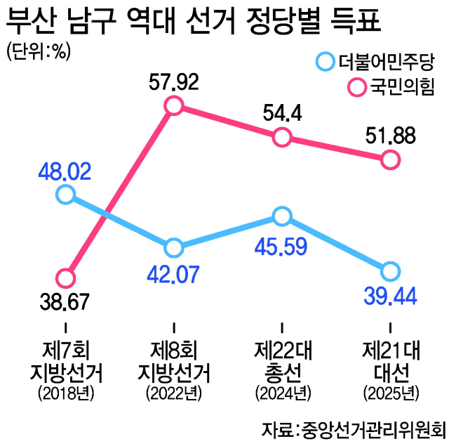 남구는 부산 16개 구·군 가운데서도 보수 색채가 강한 곳으로 꼽힌다. 용호동·대연동의 대단지 아파트를 필두로 한 부촌·중산층 거주지를 주축으로 보수 유권자들이 밀집해 있다. 그러면서도 고등학교와 대학교가 밀집한 청년층 인구, 금융단지로 탈바꿈한 문현동, 원도심 성격이 짙은 용당동·감만동이 공존해 다양한 유권자층이 혼재하는 곳이기도 하다.