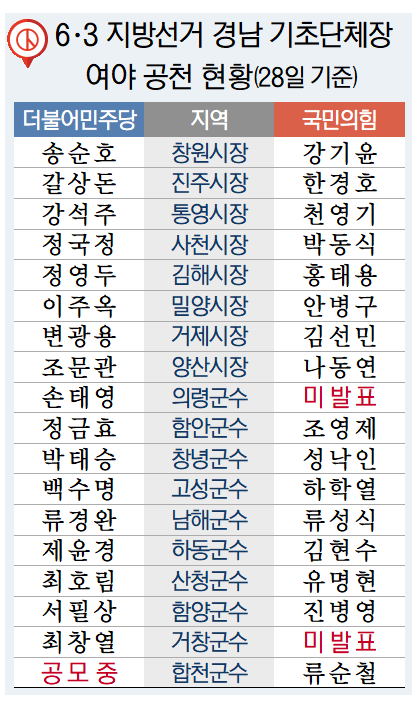6·3 전국동시지방선거가 한 달 남짓으로 다가왔지만 여야 모두 경남 기초단체장 공천을 마무리하지 못하고 막판 애를 먹고 있다.