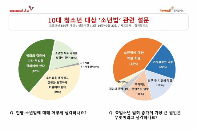 최근 소년범죄를 다룬 드라마가 인기를 끌면서 미성년자에게 형량을 줄여주는 '소년법'에 대한 관심이 높아지고 있다. 소년범에 대한 처벌을 강화해야 한다는 주장과 교화에 초점을 맞춰야 한다는 주장이 엇갈리는 분위기다. (주)형지엘리트의 교복 브랜드 엘리트학생복은 소년법에 관한 10대들의 의견을 알아보기 위해 청소년 830명을 대상으로 온라인 설문조사를 실시했다고 30일 밝혔다.