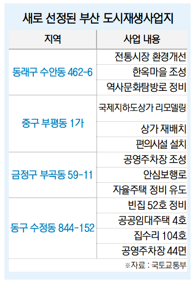 부산 동구 수정동 빈집 52호가 철거되고 부평동 국제지하도상가는 리모델링과 상가 재배치가 이뤄진다. 동래구 수안동에는 전통 한옥을 지어 한옥마을을 만드는 동시에 역사문화탐방로가 정비된다.
