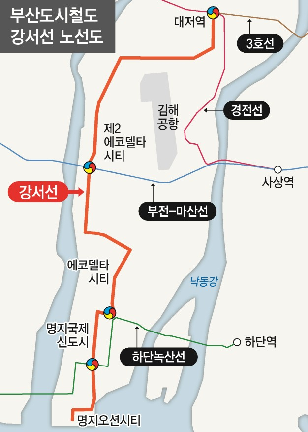 강서선 총사업비는 국비 3722억 원, 시비 2480억 원, 분담금 1050억 원 등 7252억 원이다. 부산도시철도 3호선 대저역에서 에코델타시티, 명시국제신도시를 거쳐 명지오션시티까지 21.2km 구간에 25곳 정거장을 둔 노면전차(트램)로 추진된다.